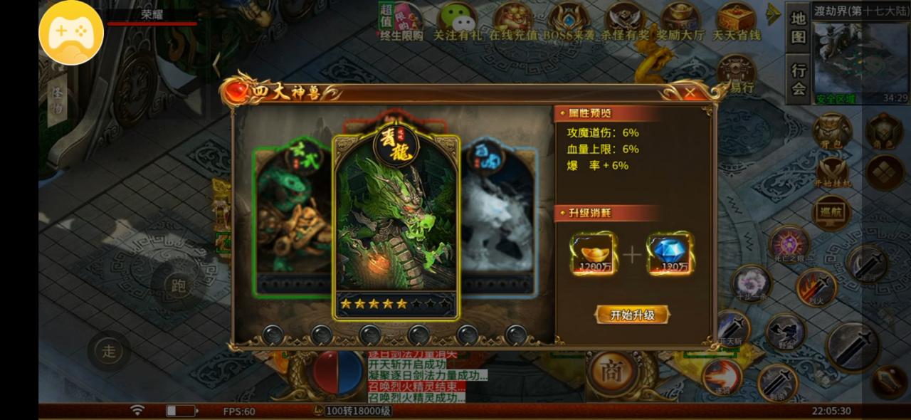 3.拿完攻沙奖励后,即使是失败,也是能直接上17大陆,称号5000累充开启,17大陆卡点在四大神兽,每个都要升满后才能下18大陆。同时也多了个9倍直购充值,不能白瓢,只能直购充值。