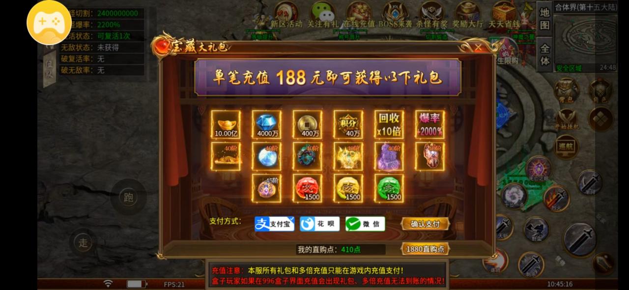 7.白瓢到680点直购点开启打金模式后,自己慢慢体会吧,不充钱,什么都可以干满,直购礼包可以用直购点购买,它就是再多,游戏里面有产出,通过挂机就能挂出来,试问?氪佬不就是比咱们快罢了!