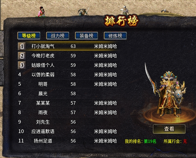 玩净土180复古传奇应该是玩了三天了,目前54级,和大佬没法比,大佬已经63级了,但是咋说呢,也还好。目前排行榜是这样的。