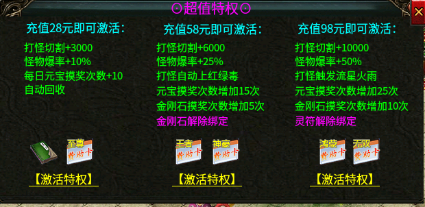 在合区后,活动地图概率出现一只名字叫仙帝妖尊的怪物,此怪物爆终极礼包、几率爆技能书(冰霜群雨、十步一杀),冰霜群雨简直是PK神技,谁用谁知道,学习了十步一杀之后即使狂暴掉了技能依然存在。