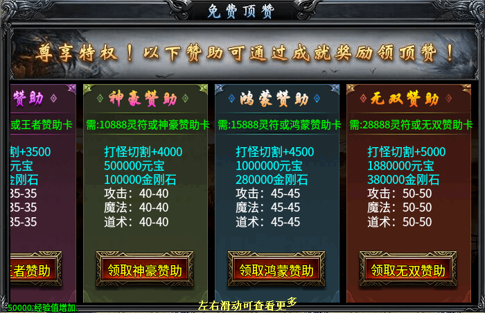 500的号就没那么痛苦了,直接该领的领了,该点的点了,切割拉满,下图撸怪。合区前去后面区观察一下,发现后面的区有俩900的号(后来才了解到是俩人一个区刚起来了所以我是受害者),因为我的资源都用在升级和提升面巾上了还浪费了不少,所以没学魔法盾,考虑到要拿沙奖励,想来想去就又充了400,一是升级盾牌,二是拿魔法盾,三是可以领二大陆的福利,一举多得。
