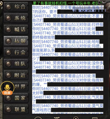 我帮大家解读一下,一合我收取了”可口可乐“进行会,他和劳资蜀道山是一个区且一直打架来着,在不是一个会的前提下我抢了他的怪,我还耐心和他解释起来,安慰他钱别白花