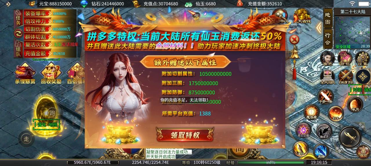 2、188元平台充值其次(本人充的就是这个档位),包含上面的所有奖励,并可以多领取:土豪秒杀称号158元奖励;拼多多之王称号188元奖励;百倍福利里面第二页九档的奖励;杀怪悬赏任务每天再多增加50轮;氪金性价比也是非常高的,对于小氪玩家来说,非常划算,快人十步。