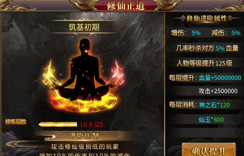 4、修仙证道,超级人物秒血功能;对修仙级别比自己低的玩家绝对压制,对敌人增加百分比的伤害,对自己增加百分比的减伤,一共25级,等级越高,获得的百分比属性越强,后期必升功能。