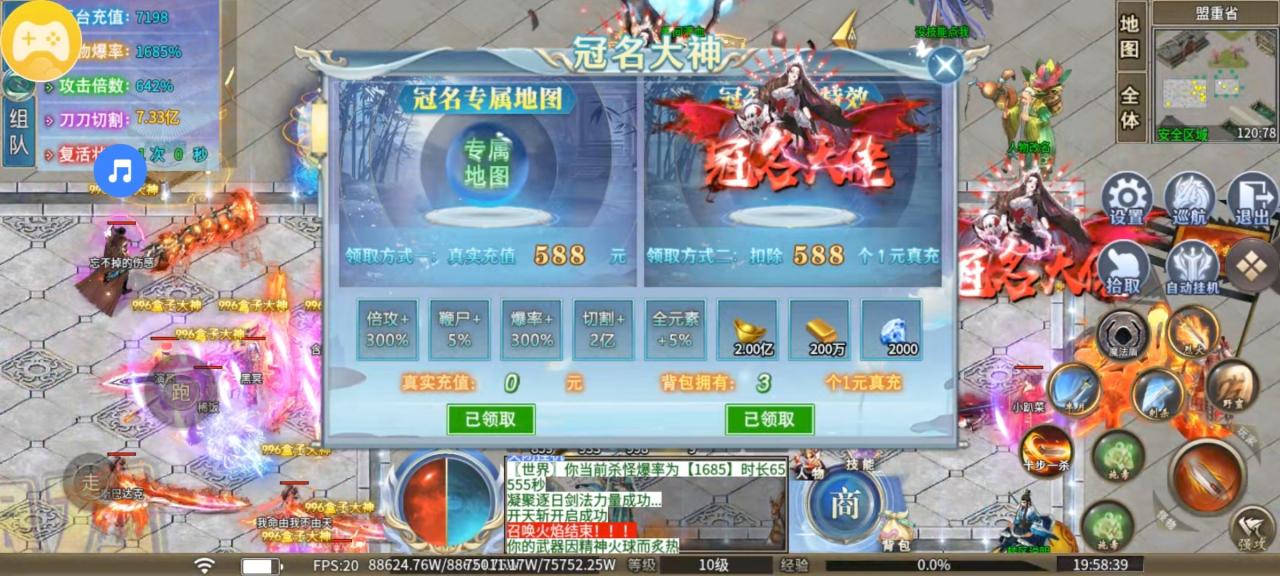 我是先存了588个红包领取了冠名,然后每个大陆杀首杀获取红包,领取充值,实在不够的就打几个boss去