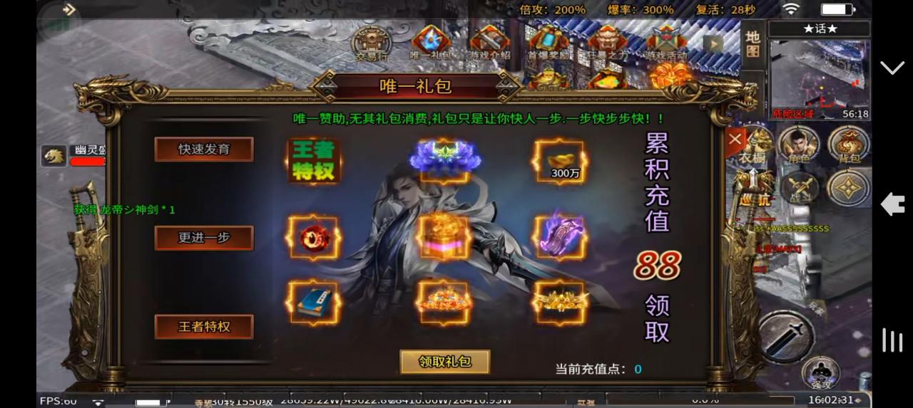28-58-88元,没错你看到的最高88元的会员礼包不是你想的88元就完事。鬼服之后88元还行!!装备回收栏里面有个冰咆哮,激活是需要充值588元。前期刷元宝金刚石嗖嗖的!