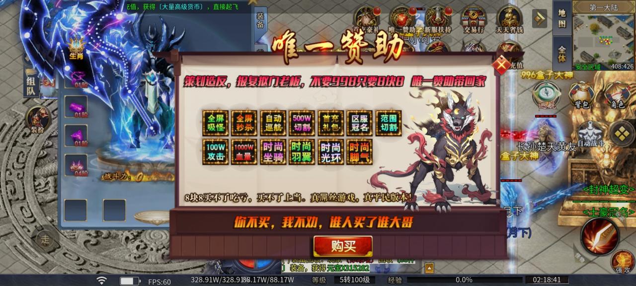2、领取上线福利、盒子福利、新服扶持福利,直接平台在线充值58元,获取58代币及580金元;没错,你没看错!此服58元是打金门槛,解锁拍卖行及材料解绑;如果你不想充58元,只想自己玩,也不想搬砖扛米,那么你只用充值8元,领取此服唯一赞助,赞助里面有最重要的自动巡航、全屏吸怪、全屏秒杀、500万切割;如果你连8元也不想充,那么我建议你可以直接退服,因为没有巡航,你根本无法挂机,下地图会被分分钟清出来到土城站岗;你又说你可以全程手动,不需要巡航,可是你少了全屏吸怪、全屏秒杀技能,你也不可能全天24小时手动挂机,你的效率跟别人对比,慢的不是一点两点,慢慢的你的差距可能连炮灰都算不上!