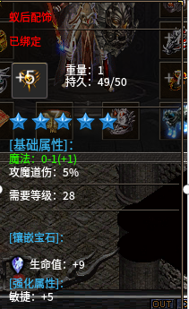 配饰推荐:蚁后配饰(攻魔道提升5%,基础道术越高提升越多)、白蚁配饰(只加单毒群毒不加)、沃玛教主配饰(魔躲敏捷都加,推荐)、远古沃玛教主配饰(敏捷和血量)。
