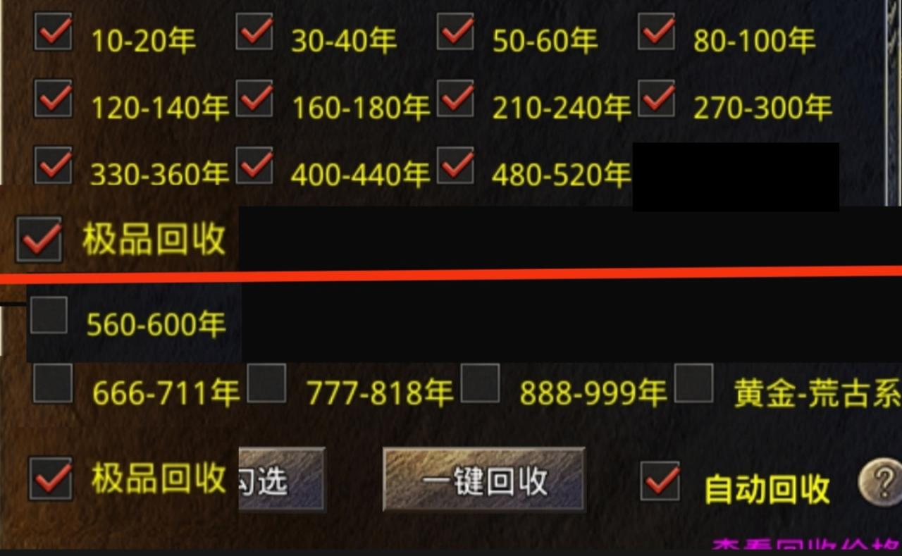 所以,我想到这个回收方法(如图):10-520年装备为元宝回收,单独设置「极品回收」。560-终极装备为积分回收,再单独设置「极品回收」。这样我打到六百多年的装备,只要不是极品就可以自动回收,而高等级装备出现极品时,也可以自动留在包里,因为后期我只需要极品属性的装备,不是极品=回收积分