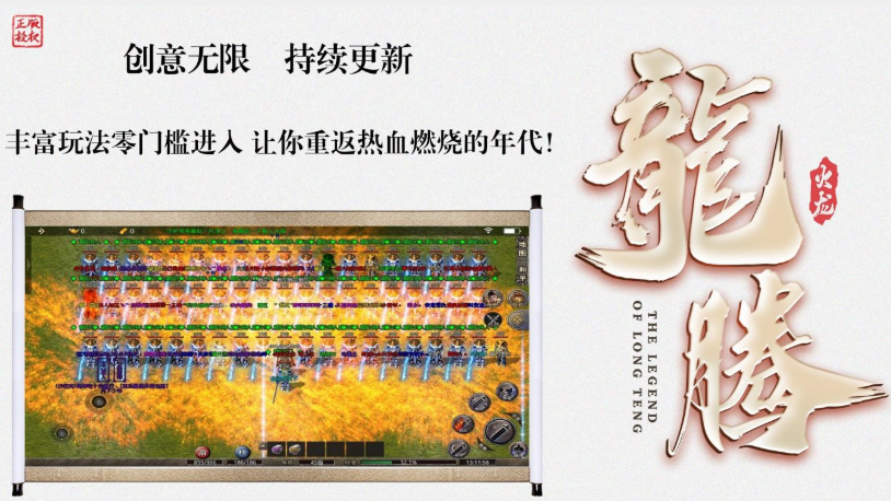 龙腾火龙运营团队三端互通1.85火龙复古版本手游,1:1还原旗下 《龙腾火龙》端游,融入多种特色,全天活动不断,无任何强制消费,我们保持着公平公正理念,用心做好每一款游戏,大格局,大品牌,正版授权,绿色纯净,真正做到千人在线,丰富玩法零门槛进入,让你重返热血燃烧的年代,一 直被模仿,从未被超越。