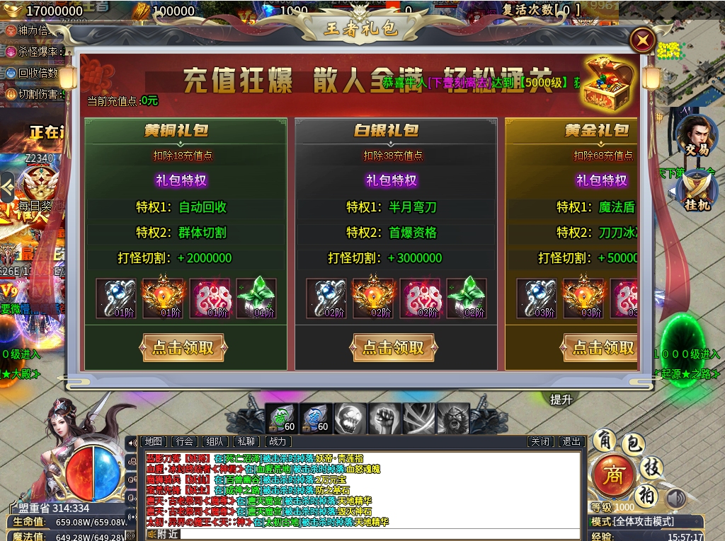 3、领取登录奖励、微信、特惠0元礼包后,直接获得自动回收和群切,充值卷打怪狂爆、每日奖池奖励丰厚、礼包赠送等,只要是用手玩,王者礼包半天均可嫖满;